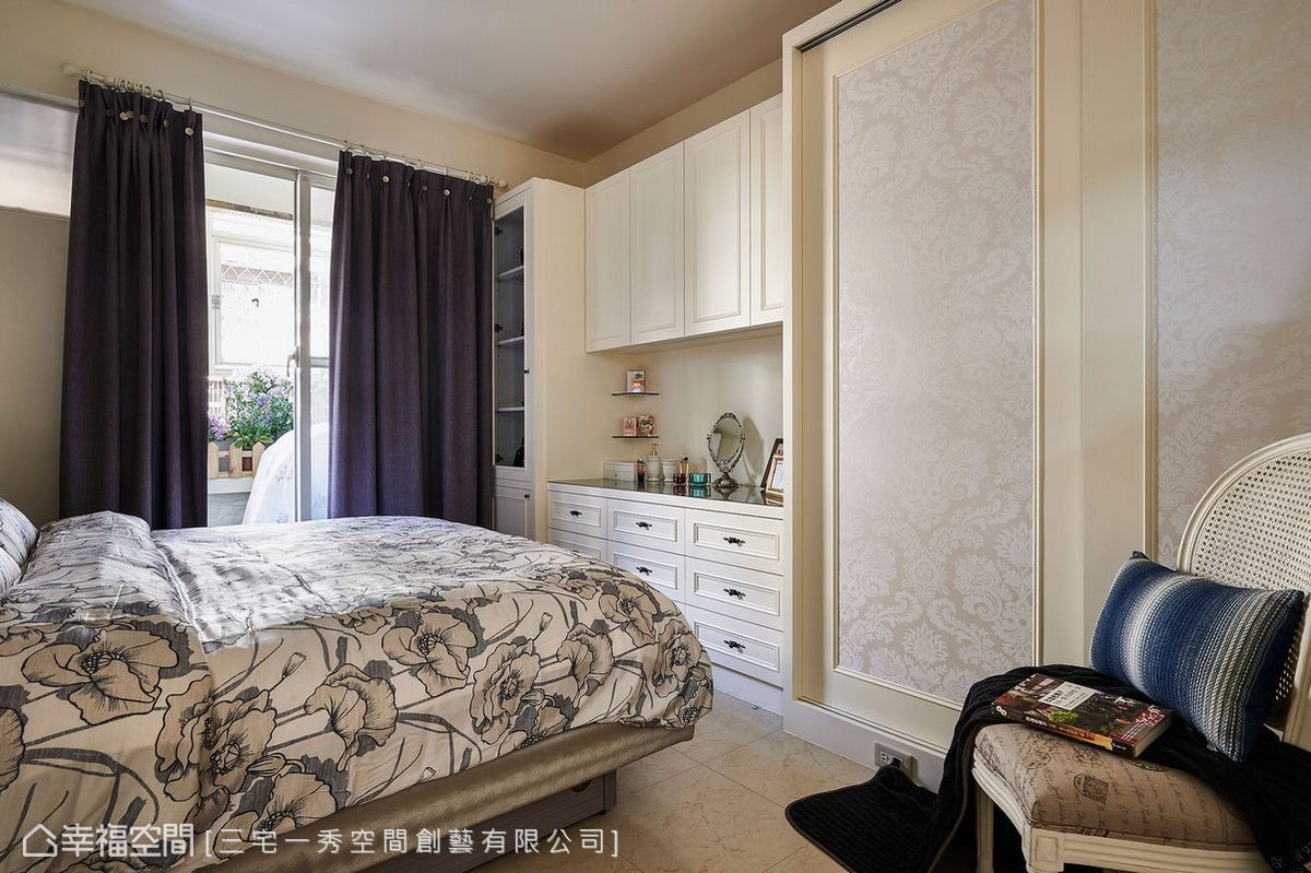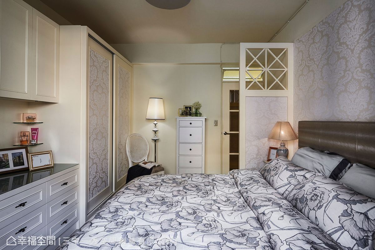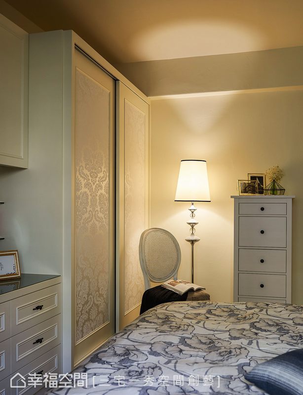 櫥櫃拉門的配置節省開闔收納的空間使用,門扇選用與床頭牆、屏風同一塊壁紙紋樣,為美式風格的造型變化,添入優雅細膩的視覺層次。