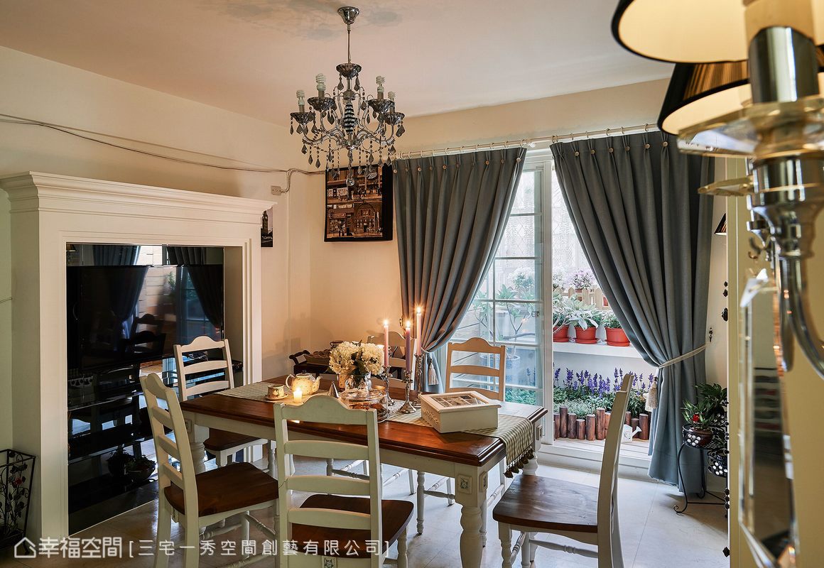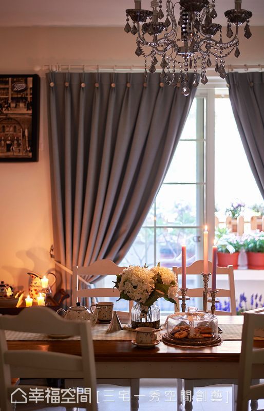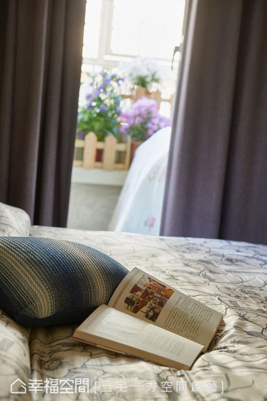 透過掛置窗簾的白色格子窗,空間以滿陽台的綠意花草為景深,讓人忘卻置身都市叢林,有了清新自然的紓壓愜意。