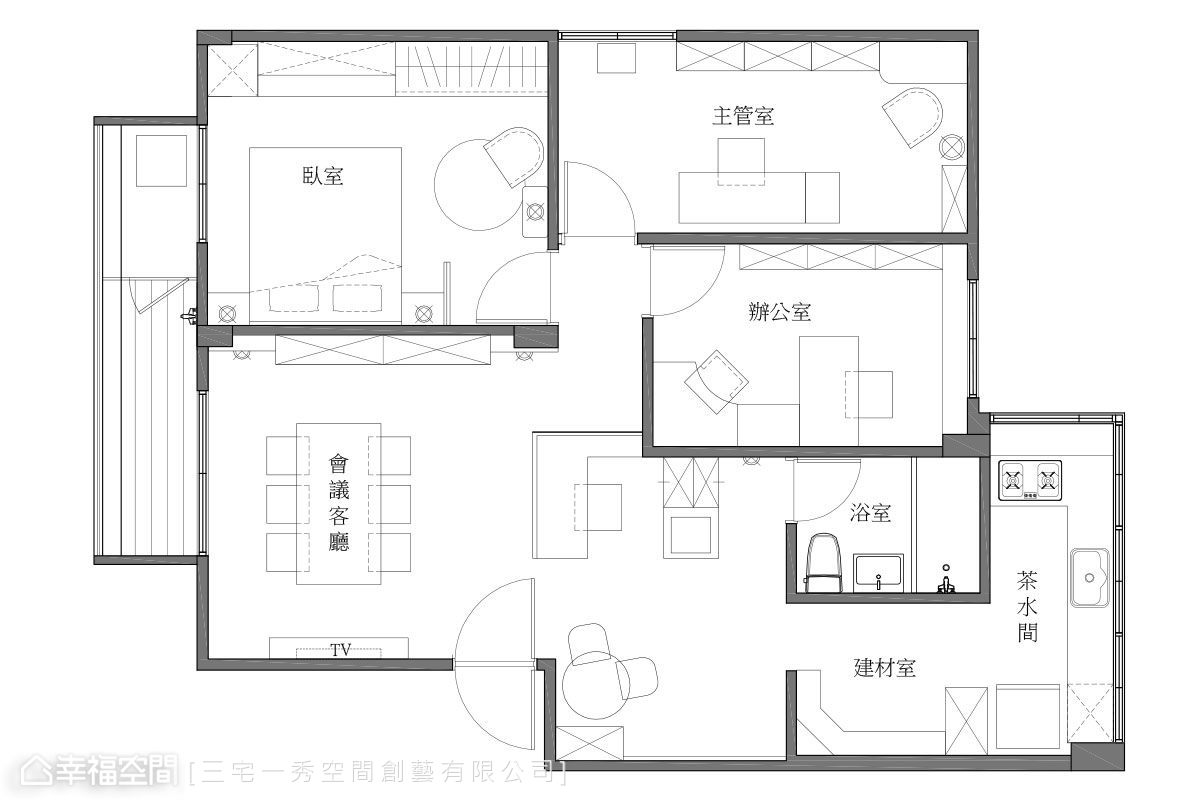 - 空間格局:玄關、會議客廳、茶水間、建材室、浴室、辦公室、主管室、臥室