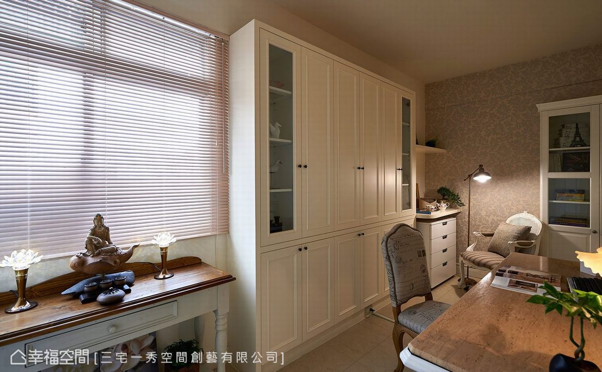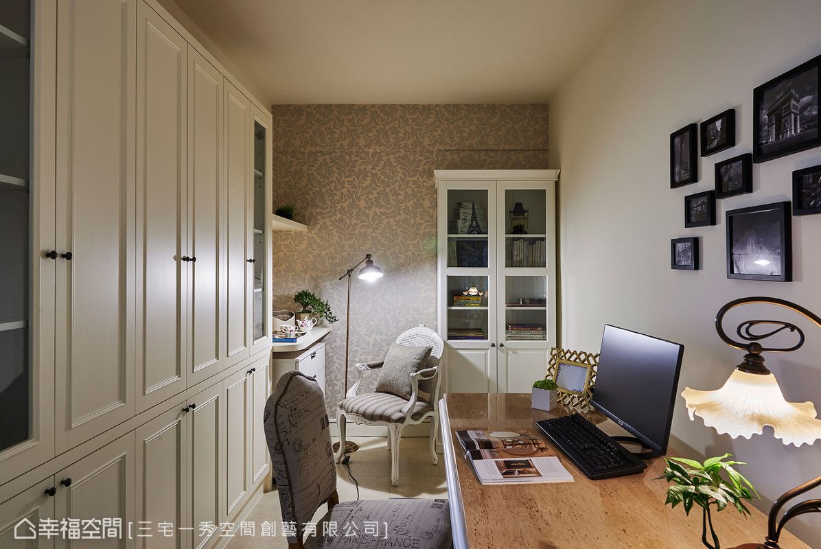空間中較長形的空間作為屋主專屬的辦公段落,經典的白色口字框造型鋪陳空間的機能收納櫃體,與壁紙構成柔和的空間表情。