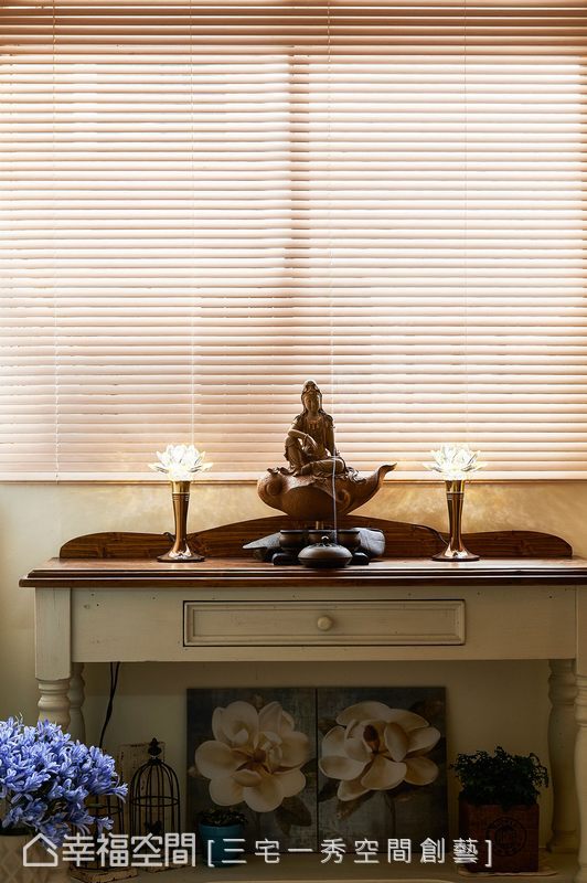辦公室一角,美式田園風的家具款式與佛教禪風的木質元素串連,不突兀的融合風格取向與信仰擺飾。