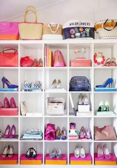 收納秘訣:如果要在視覺上更好看,可以用顏色分類擺放,也可以將鞋跟高度相同的擺放在一起。