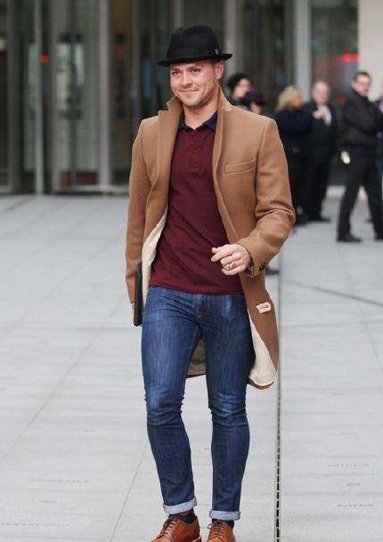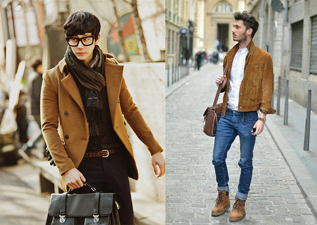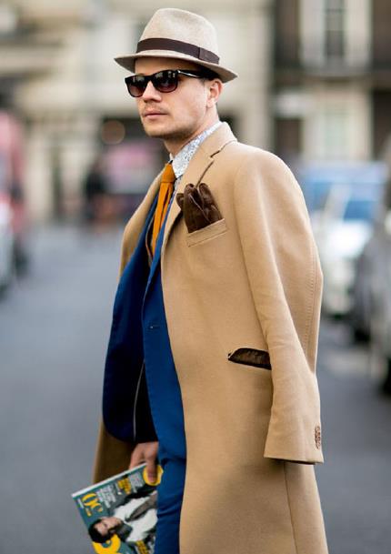 3、非常具有歐美風格的紳士打扮,駝色和黃色搭配相對不容易駕馭,