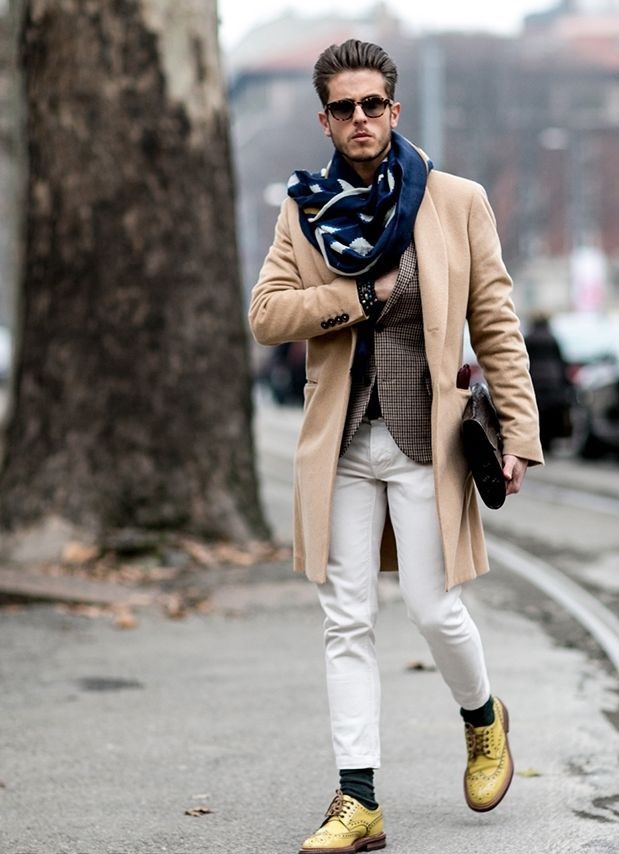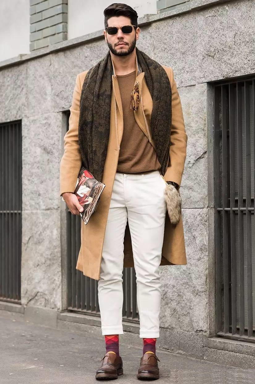 一條白色褲子,格紋西裝,加上大地色系的圍巾,復古油頭和牛津鞋,都能讓駝色大衣顯得更加有質感。