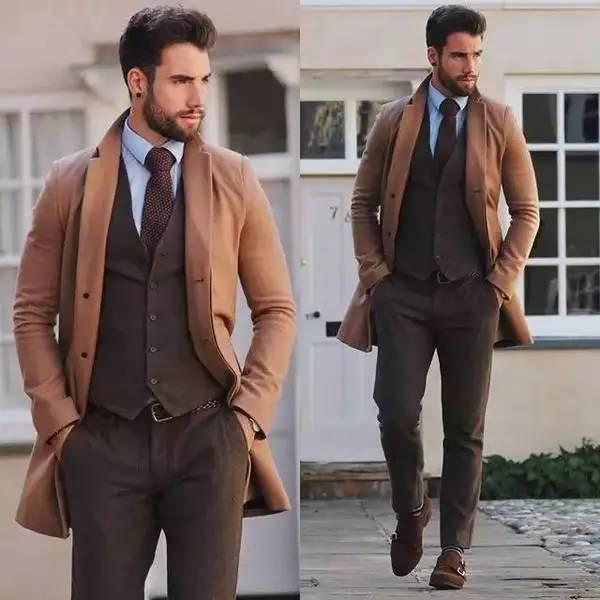 西裝配大衣是每天秋冬最流行的裝扮,灰色西裝與駝色進行搭配後,能夠輕鬆顯現出你的穿搭功力。