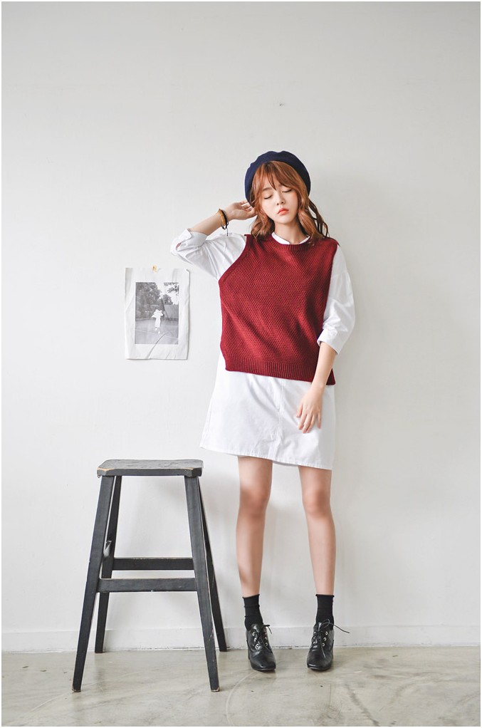 耀眼的紅色針織背心很易配搭,只要配上清色系的衣服+貝蕾帽就很能突出文青氣息了!