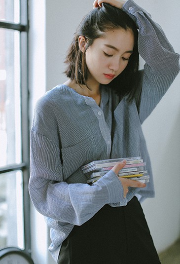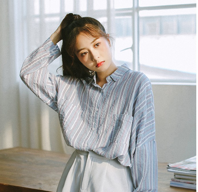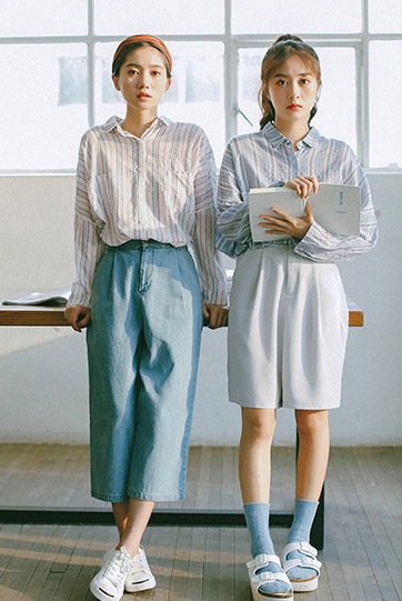 粉嫩配色的條紋翻領薄襯衫配搭短款灰色褲,打造可愛清新的少女味喔!
