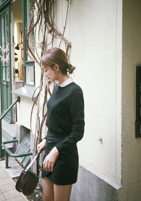 白色襯衫配搭黑色毛衣,加上黑白條紋的短裙,看起來不但不會單調,而且更打造迷人的少女氣質啊~