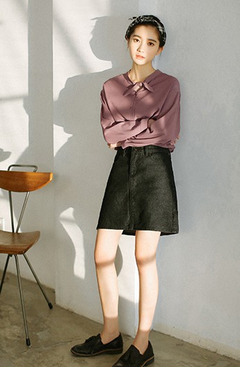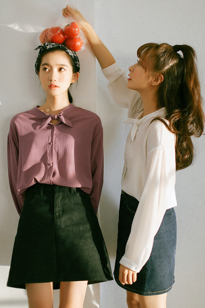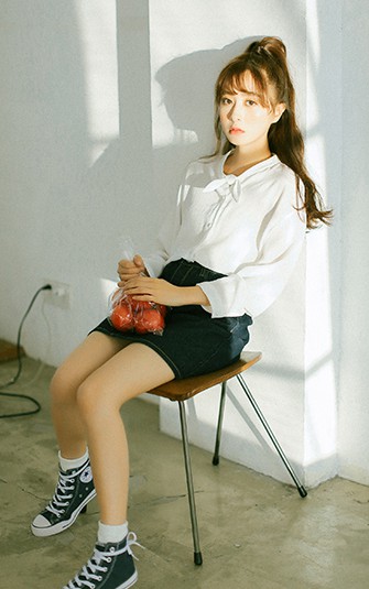 兔耳朵領結雪紡白色襯衫配搭丹寧短裙,加上深藍高筒球鞋,打造甜美的少女風~