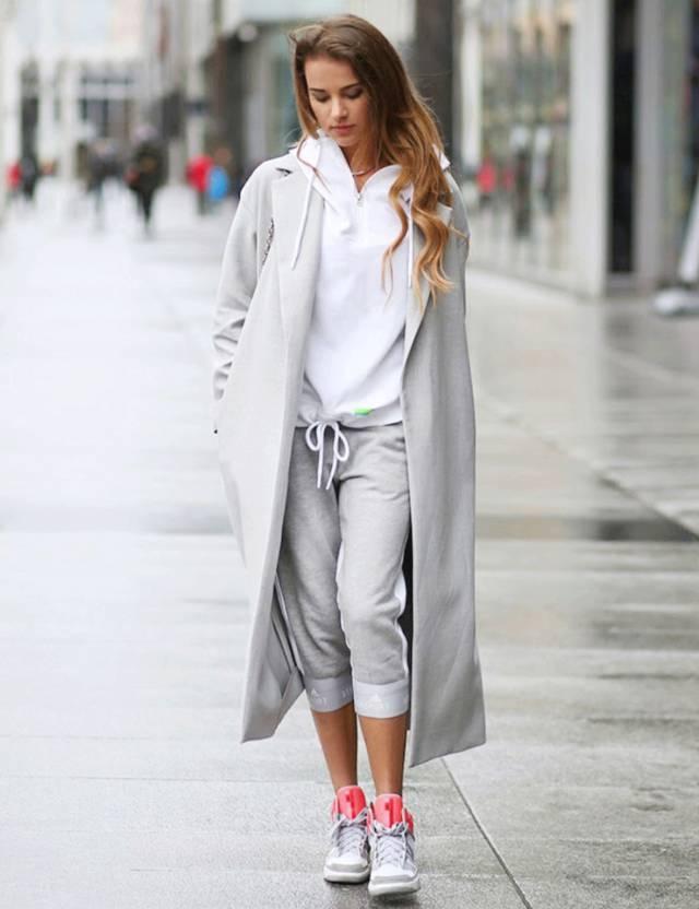 像Karlie Kloss這樣大衣+球鞋+運動褲的造型是她們去健身房路上的必備。