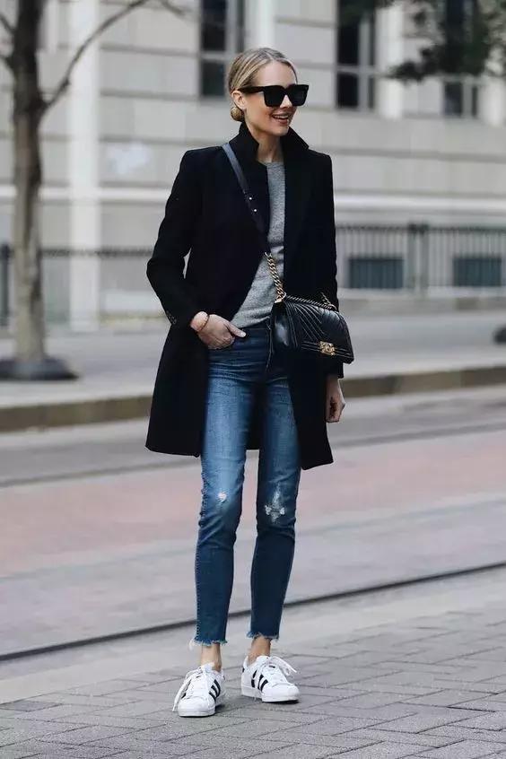 黑灰白大衣+小白鞋