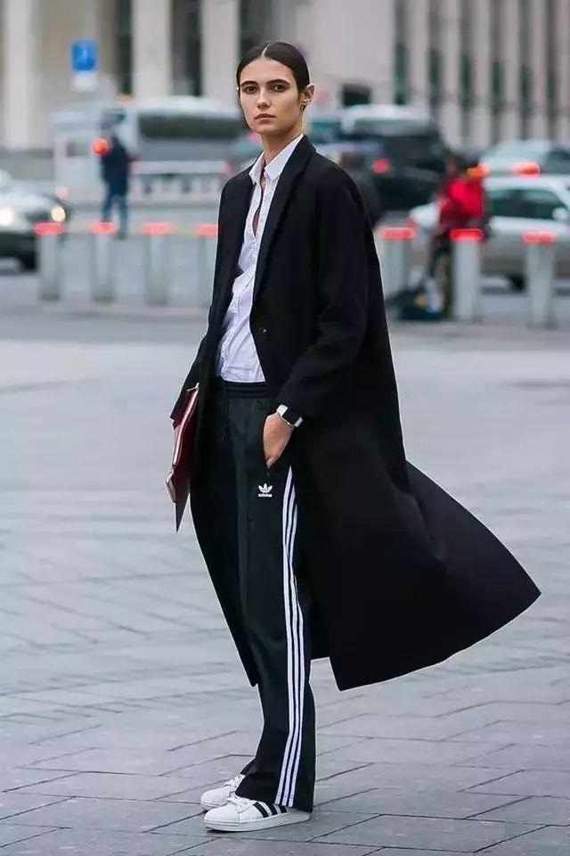 比如,上圖的黑白經典搭配,因為Adidas運動褲的加入而變得更有活力。