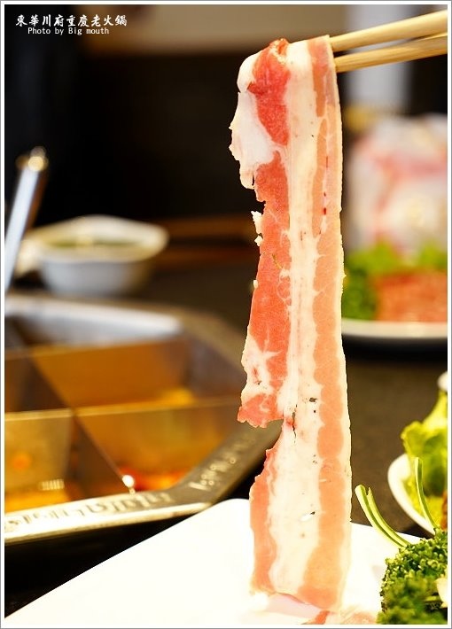 ▼嗜辣的朋友可以選擇麻辣紅油九宮格(350元/份),吃起來更有老火鍋的感覺!會使用九宮格鍋其實有特殊的文化背景,一來是因為不同食材在不同的格子裡涮煮,一方面比較好找,二方面味道比較不會混雜;二來是說重慶人有時候會併桌使用同一鍋,所以很容易會跟不認識的人一起吃飯,這時候一個人使用一個格子也比較不會錯拿別人的食材,真的很聰明!另外還有一說則是中間格子的火比較旺,適合涮煮只需幾秒的食材,旁邊的格火較弱但均勻,適合涮肉品類,最角邊則是適合涮煮需要久煮的食材,這樣一來就可以吃到最剛好、最美味的鍋物啦!