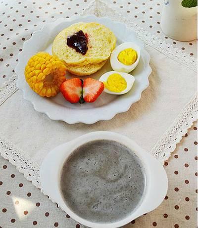 18、果醬麵包+玉米+白煮蛋+黑芝麻糊+草莓