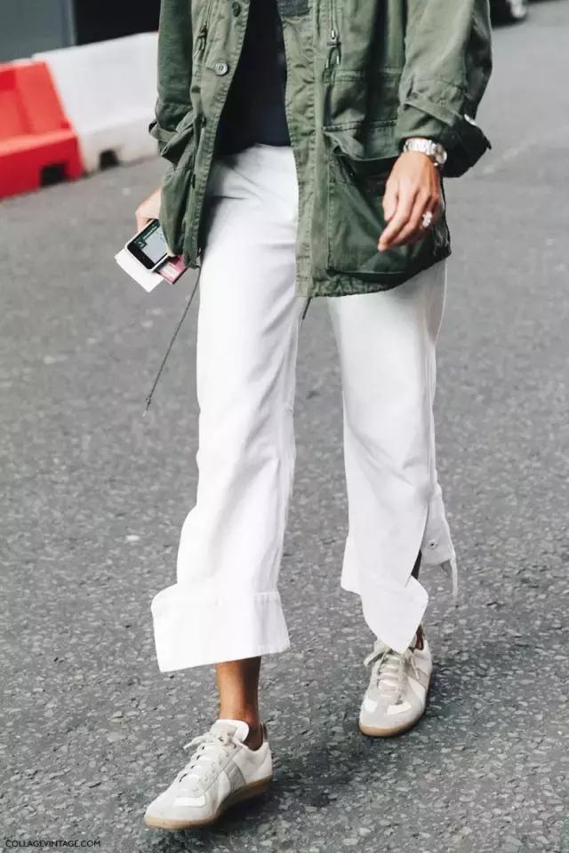 用正式的白色襯衫疊搭再加上一條流蘇邊褲子。是不是非常時尚呢。軍綠襯衫穿出時尚的技巧,減輕休閒感。