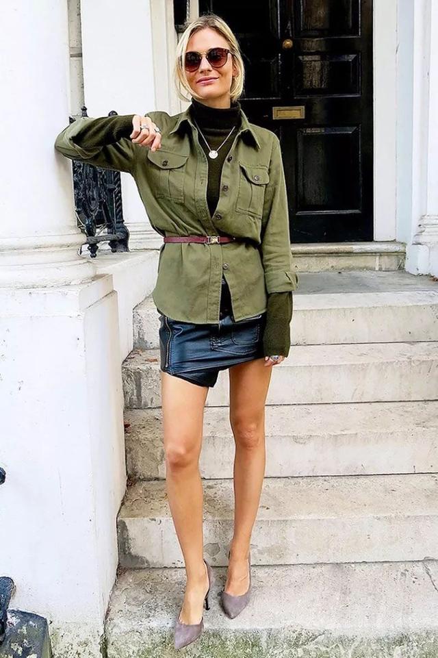 軍綠色的上衣×白色的喇叭裙,成熟女性的甜辣混搭風,
