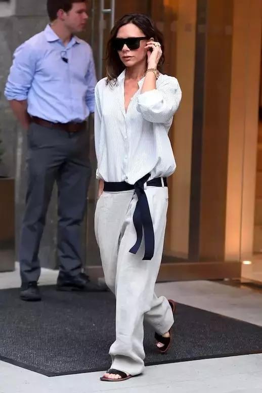 如果沒有大長腿,闊腿褲搭平底鞋的時候,要記得打造高腰,否則分分鐘穿成五五身,很會穿的貝嫂也難逃一劫。