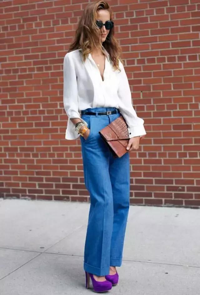 闊腿褲搭配高跟鞋,挺拔顯高的同時很有氣場。不過不要搭配防水台過高的高跟鞋,防水台會讓高跟鞋顯得笨重,再搭配闊腿褲,不但不會顯高,還會暴露了你“矮”的本質,