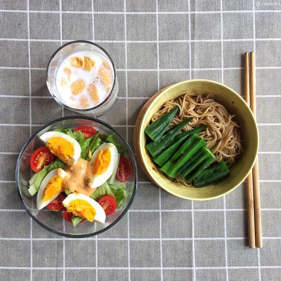 炸醬麵秋葵,雞蛋素沙拉,牛奶玉米片。