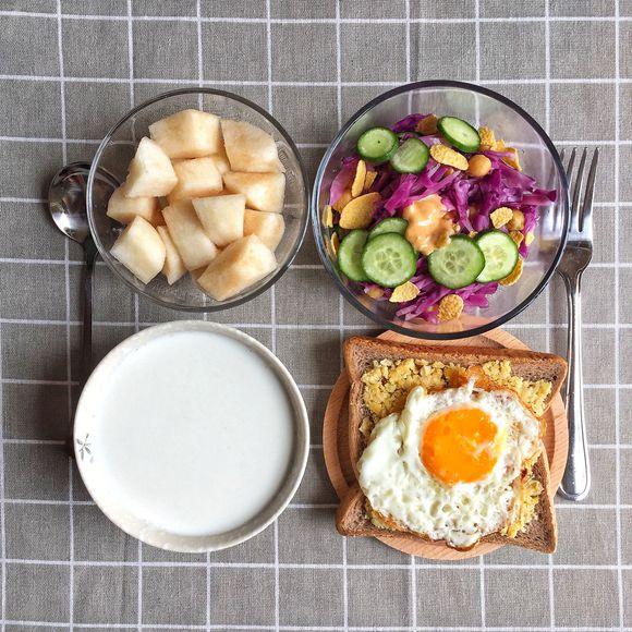 鷹嘴豆煎蛋全麥麵包片鷹嘴豆小黃瓜紫甘藍沙拉牛奶燕麥梨