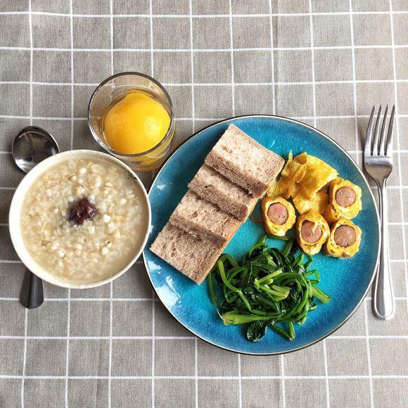 薏仁紅棗粥全麥麵包片菠菜雞蛋捲維也納腸黃桃