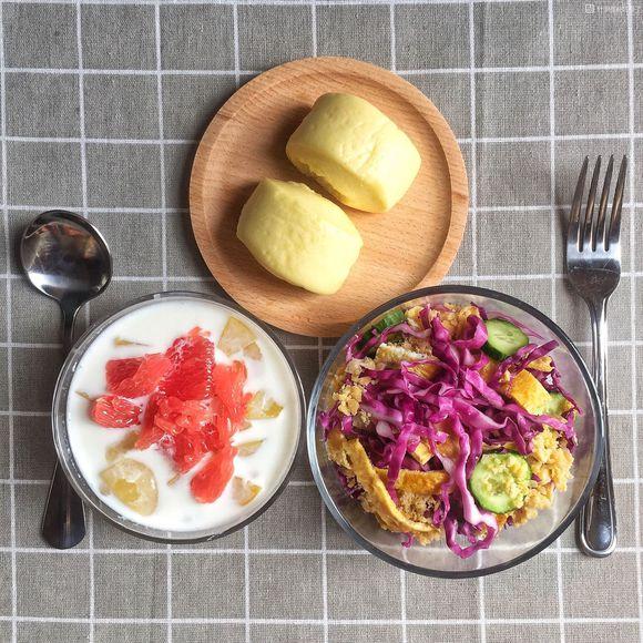 韭菜雞蛋攤手抓餅紫甘藍小黃瓜維也納腸沙拉牛奶燕麥西柚
