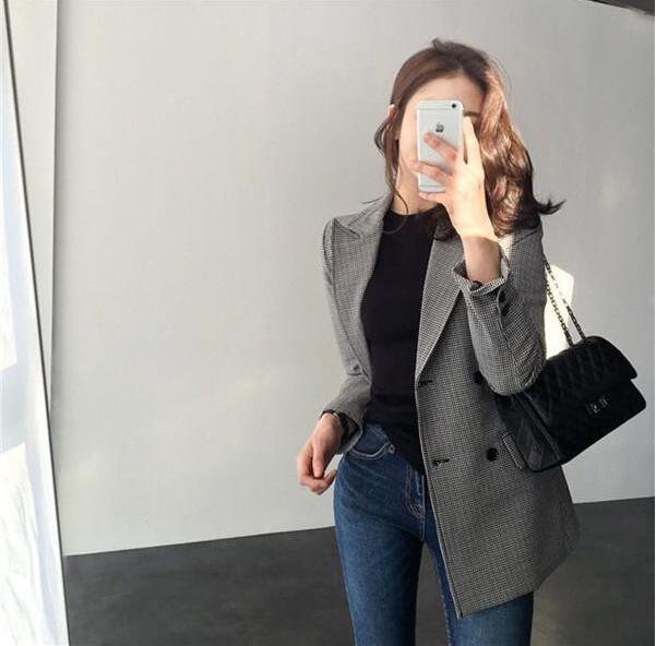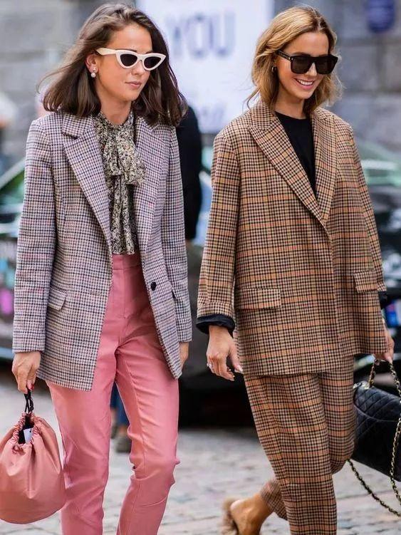 復古潮流搭上女性崛起,西裝外套也一改呆板形象,中性灰、淺棕色格紋應用,