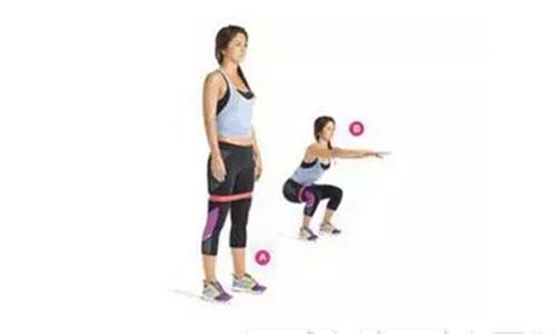 利用一根彈力帶,雙腳用力分開,與肩同寬,下蹲,注意膝蓋盡量不要超過腳尖!