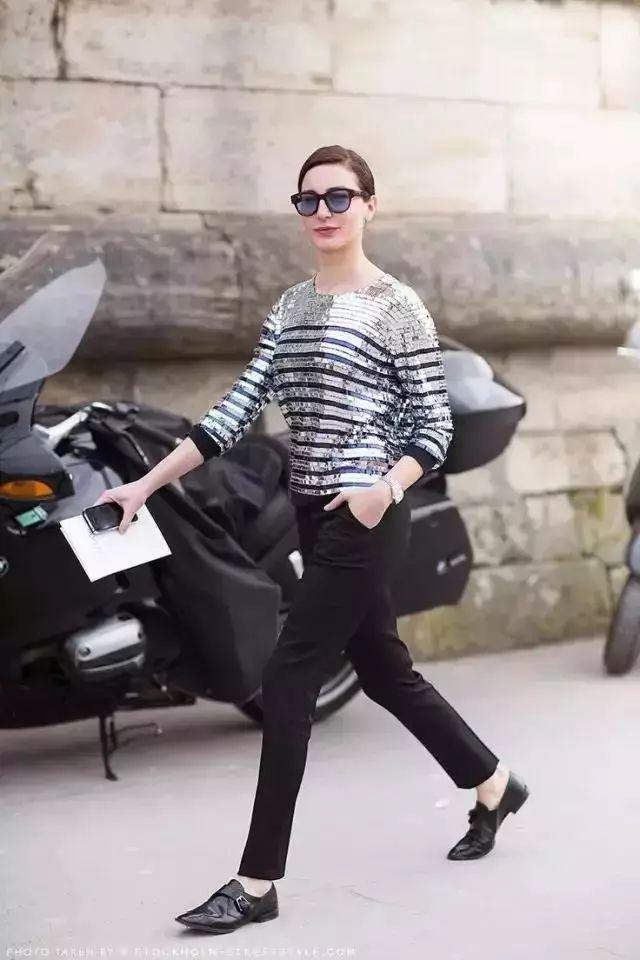 比如這種羽毛下擺的條紋針織衫,本身是有一點小drama的,但配吸煙褲就和諧了。