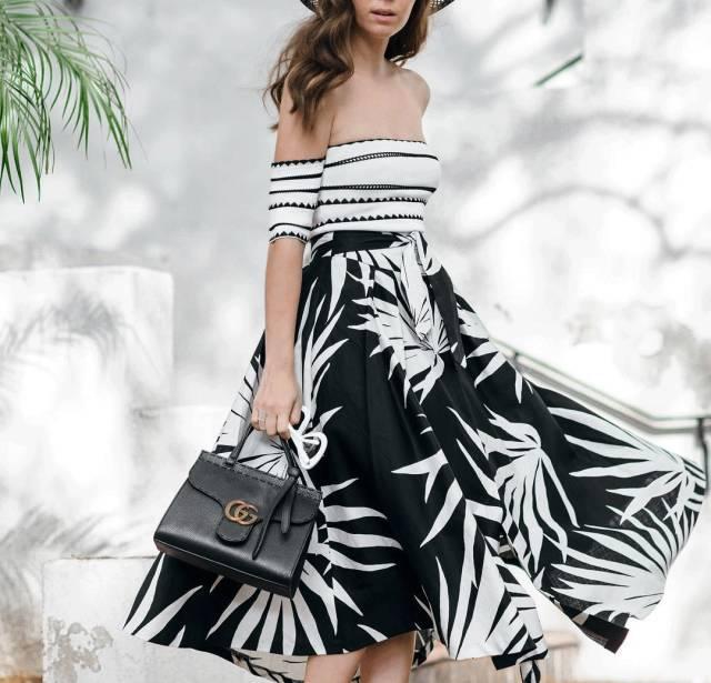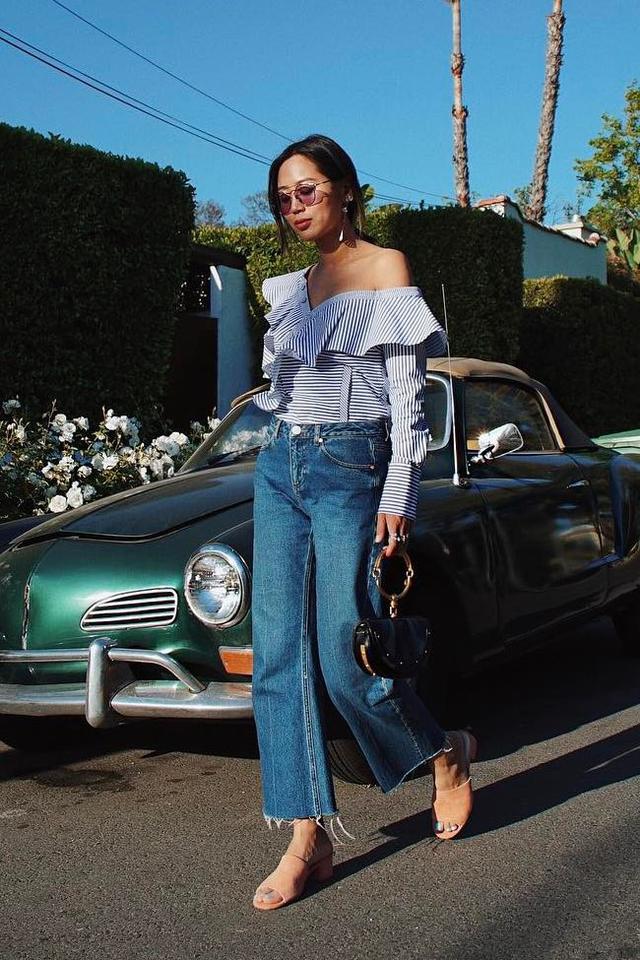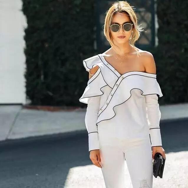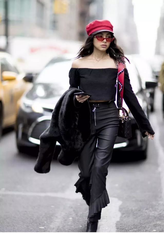 雖說寬肩要盡量避免露肩,但可以“巧露”,比如只露一半肩的斜肩穿法,既性感,又不會突出缺點,很好的弱化了肩膀的寬度。