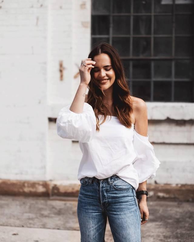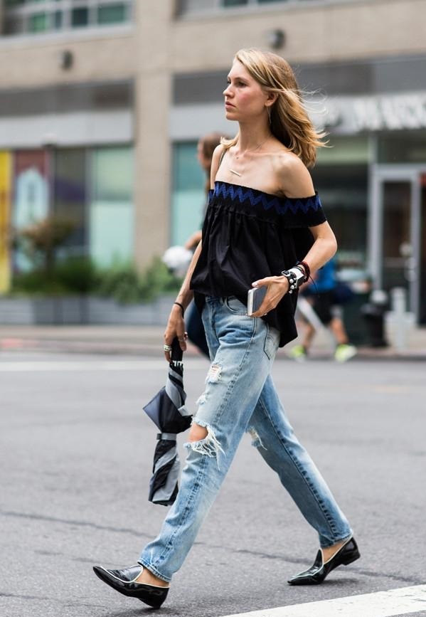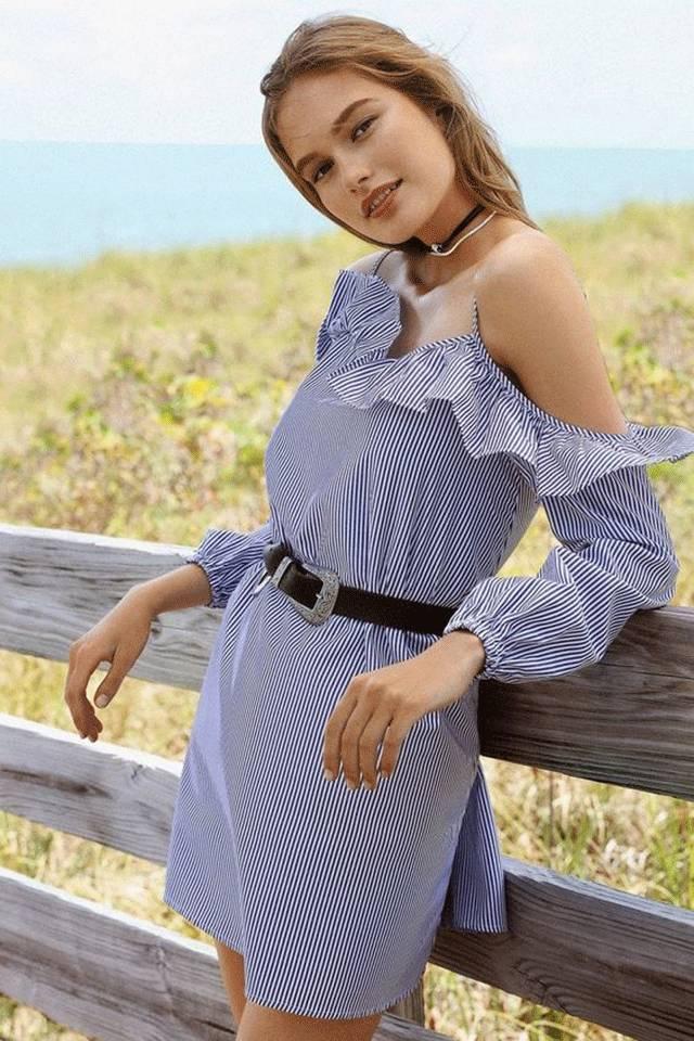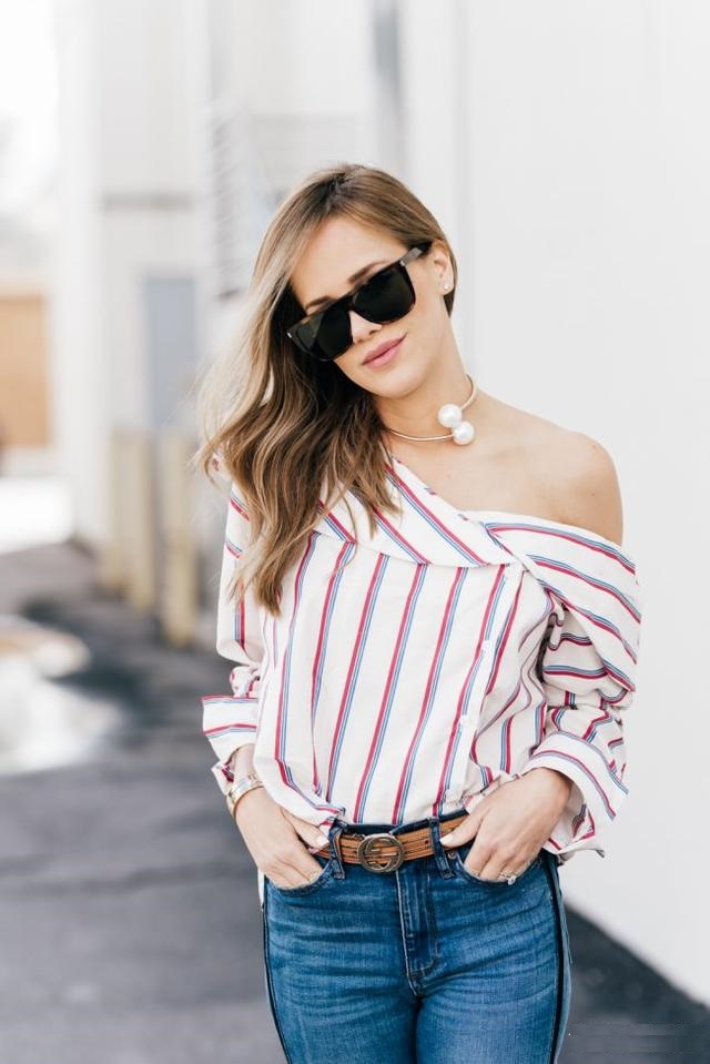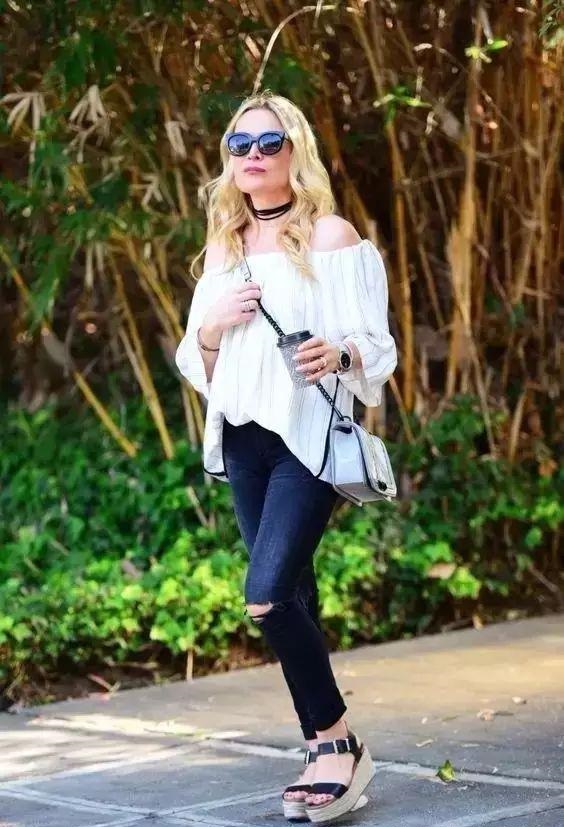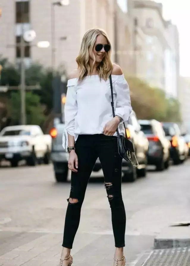 露肩的一字領或掛脖吊帶類上衣也是不錯的選擇。即使你的肩膀很窄,但把雙肩全部露出來,能讓人產生一種橫向的視覺,很自然的延伸了肩部的距離,從而營造了寬肩效果。