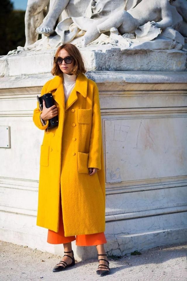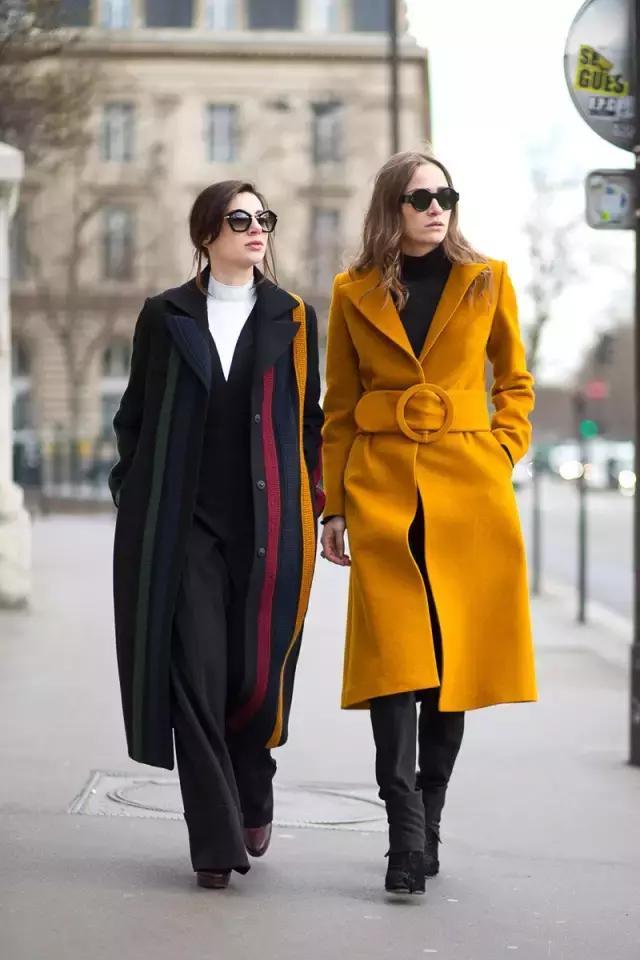 薑黃色大衣有種隨性的風格,搭配黑色高跟鞋可以讓冬天裡都溫暖起來。