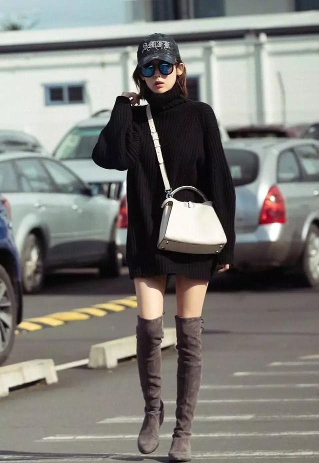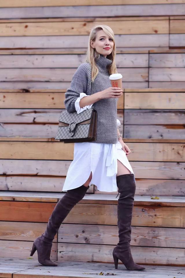 同時大毛衣和緊身的過膝長靴還能夠形成“上寬下緊”的對比,從而讓下半身看起來更加纖細。