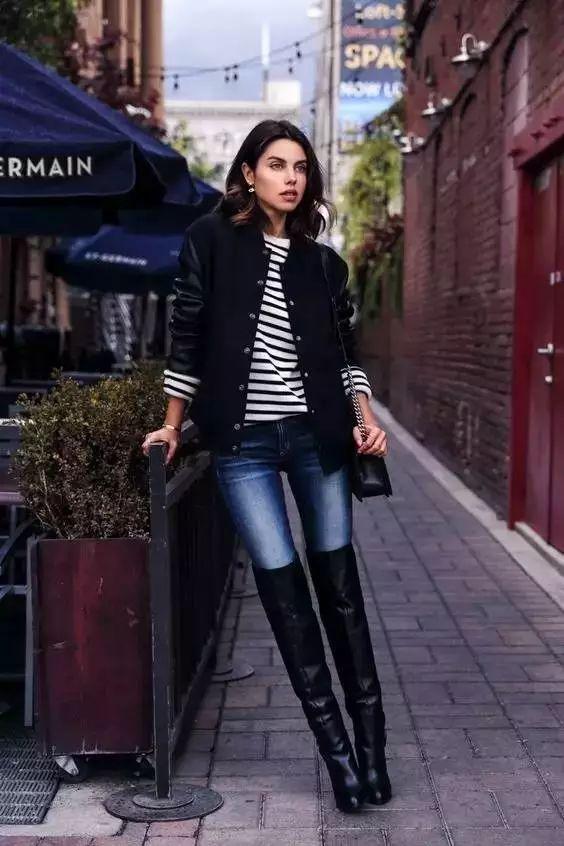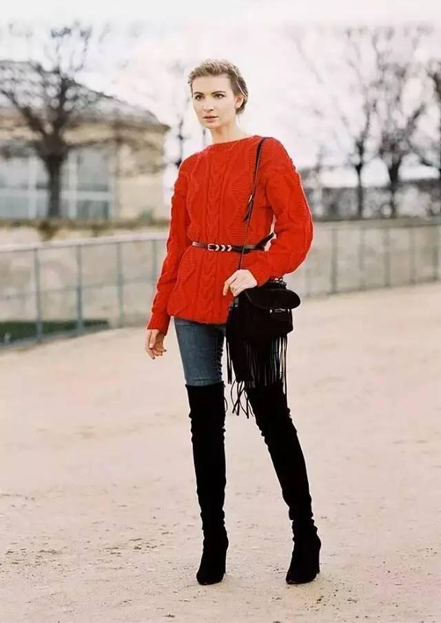 短款毛衣和緊身褲,搭配長靴超級顯瘦,這個要求大腿細才能穿