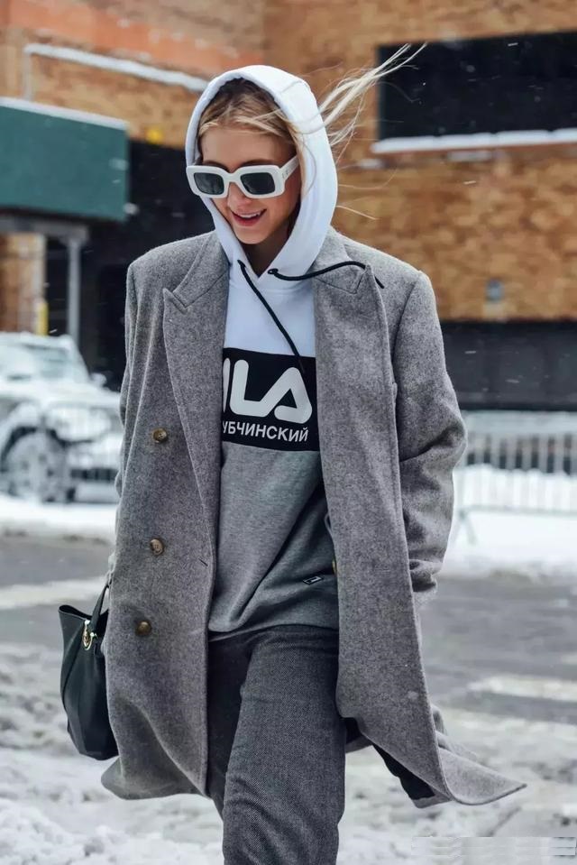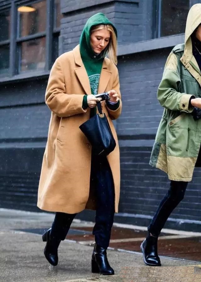即使是花哨的長外套內搭一件Hoodie就能起死回生。