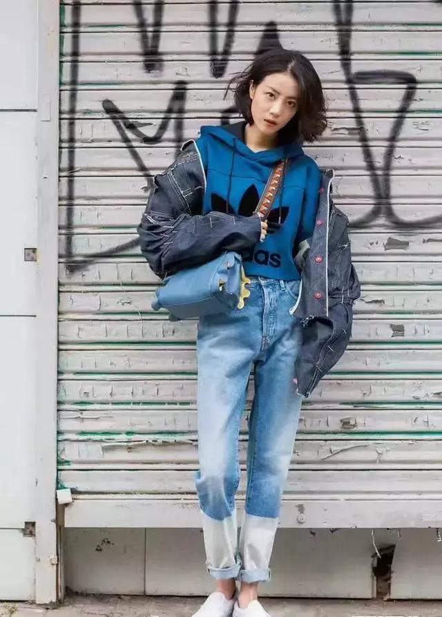 除了長到可以當裙子的長款衛衣最近也很流行短版的帽T,搭配高腰單品和球鞋,