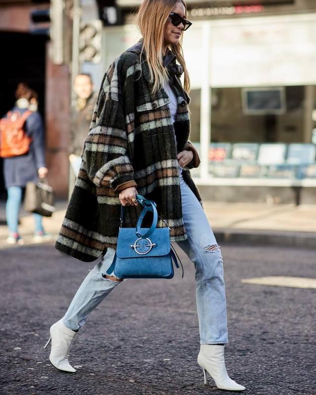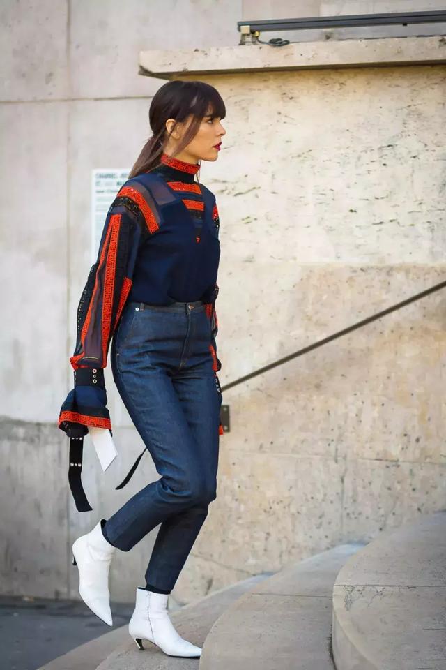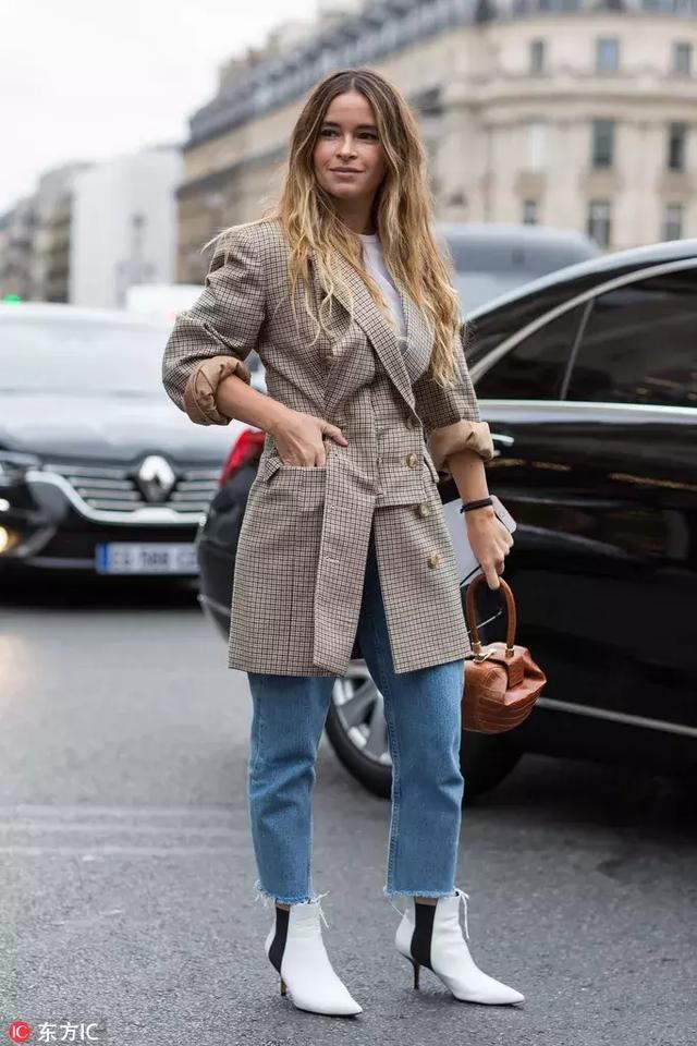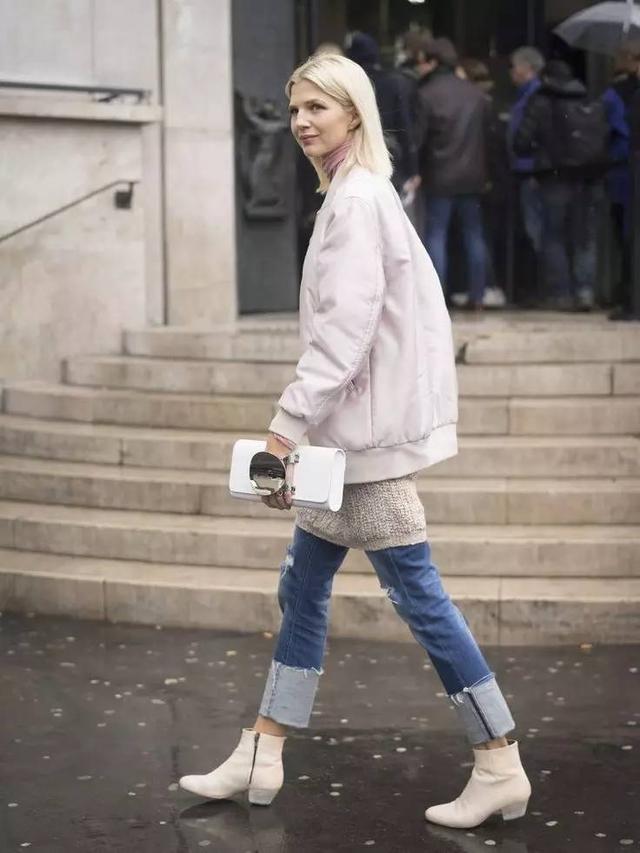 牛仔褲選擇7-8分長度,步履間若隱若現露出腳踝,這雙白色短靴會更時髦!