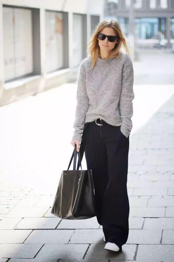 寬大的毛衣穿起來顯得上半身很“重”,那麼下半身就應該搭配得“輕”一些,