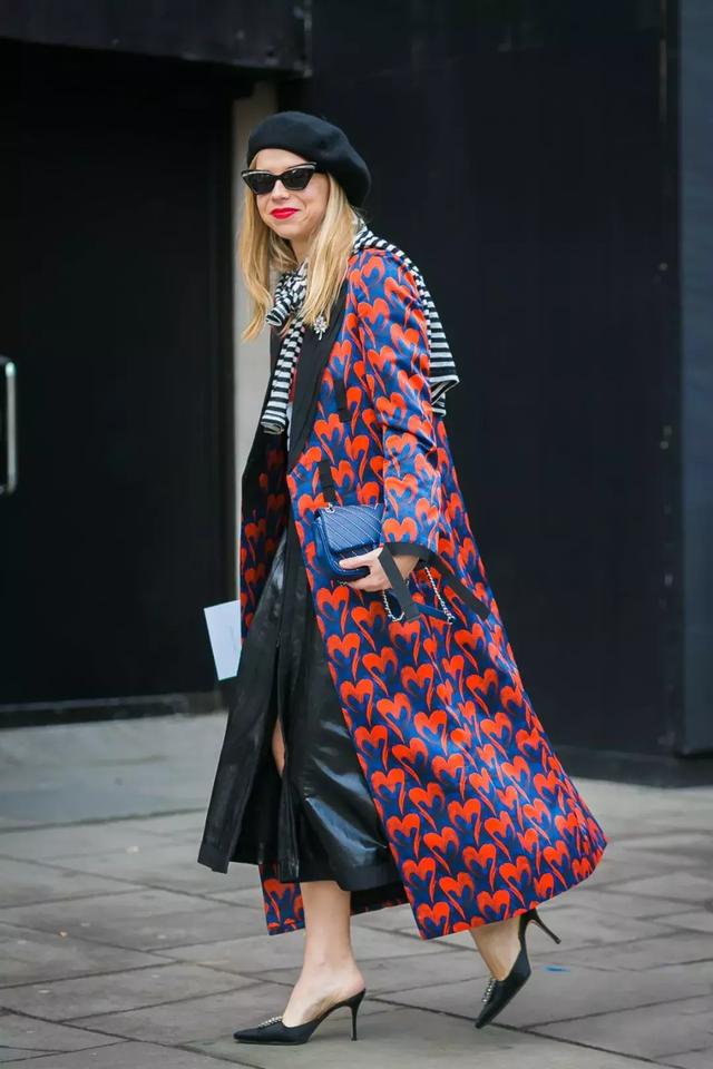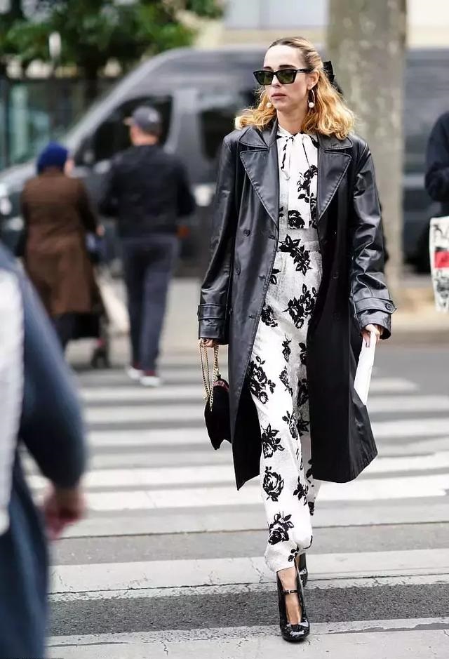 像上圖這張街拍就是很好的例子,外套的大印花與長裙的小點綴,一收一放,達到了很微妙的平衡感。