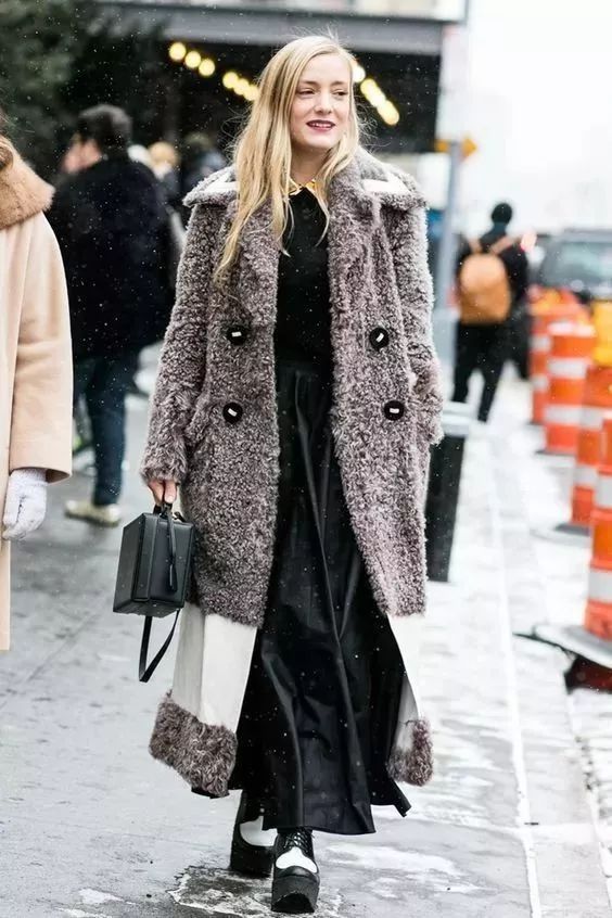 秋冬天的黑白灰穿搭容易讓人聯想起厚重、沉悶,你可以學著搭配長外套+長裙,