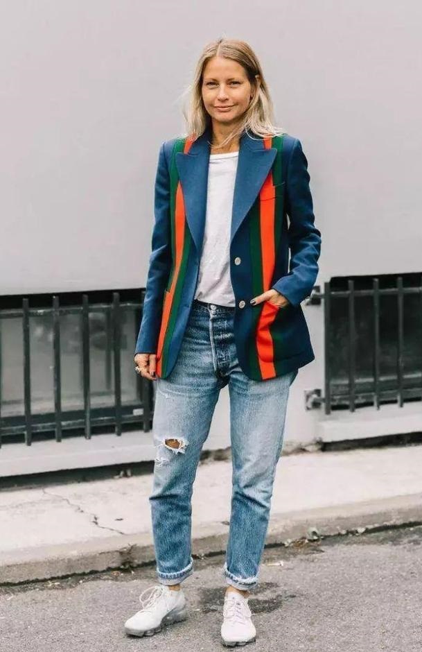 而藏藍色、黑色或者深灰色的牛仔褲就會使下半身的色彩和諧統一,