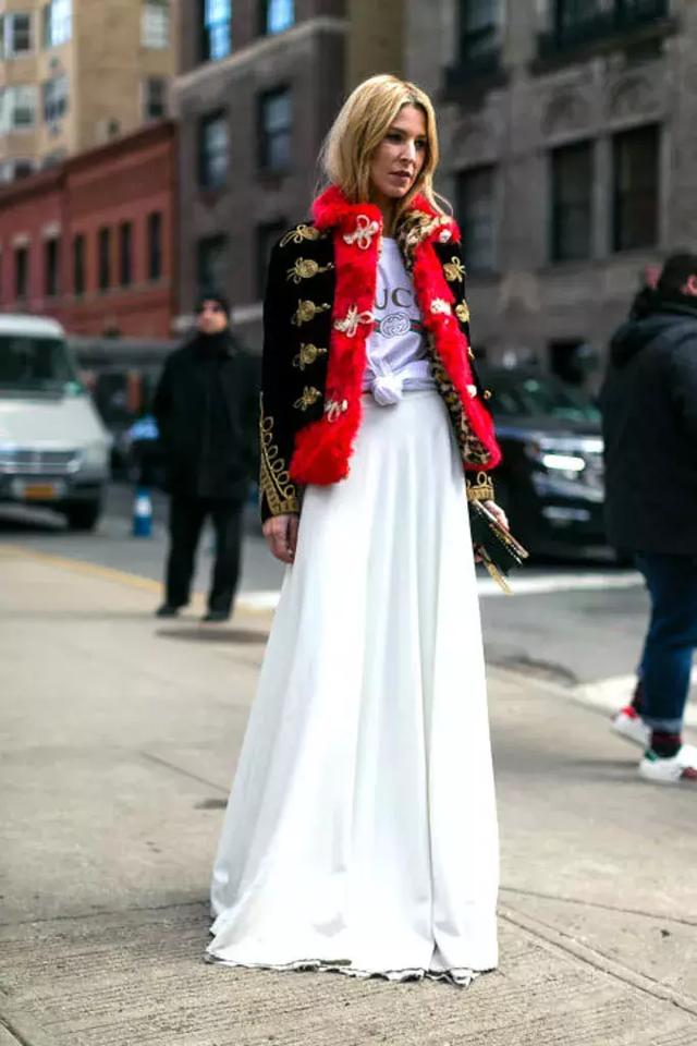 除了大衣,印花長裙和皮草也能相互襯托,皮草外套原本帶有一些更成熟的韻味,