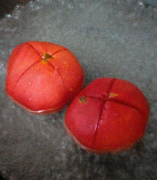 (2)西紅柿切十字刀,在熱水燙個十幾秒,去皮,切成塊。