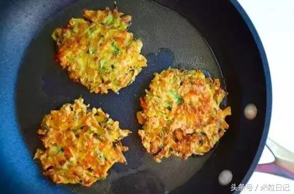 3. 平底鍋燒熱,在鍋底刷一層植物油,用勺子舀出適量彩蔬煎餅原料放入鍋中,並壓成圓餅狀,煎至兩面金黃即可取出食用。