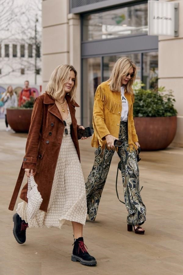 流蘇邊披肩+流蘇下擺半裙,有層次感不顯累贅,搭配厚底樂福鞋,走路帶風,可帥了。