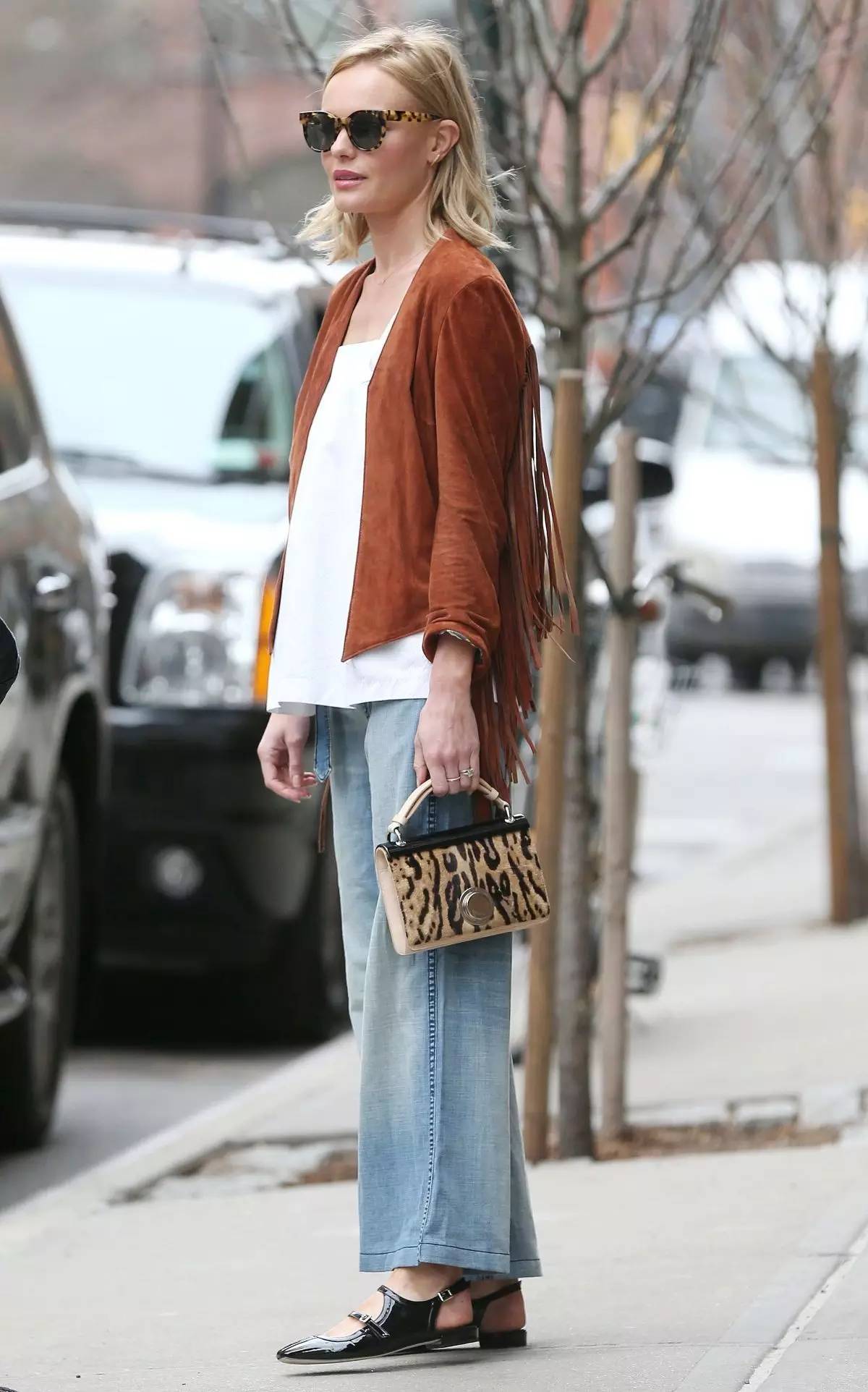 質樸的軟麂皮絨面料,在流甦的層疊裝飾效果也是個性十足,麂皮和流蘇搭配的恰到好處,融合在一起形成一種複古又俏皮的風格,下裝搭配一條牛仔褲,簡約幹練。