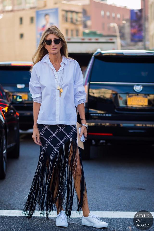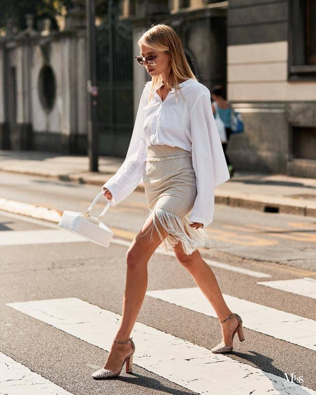 嚴肅正經的襯衫搭配靈動自由的流蘇裙,讓整個造型多了幾分女人味,摩登又不顯繁複。