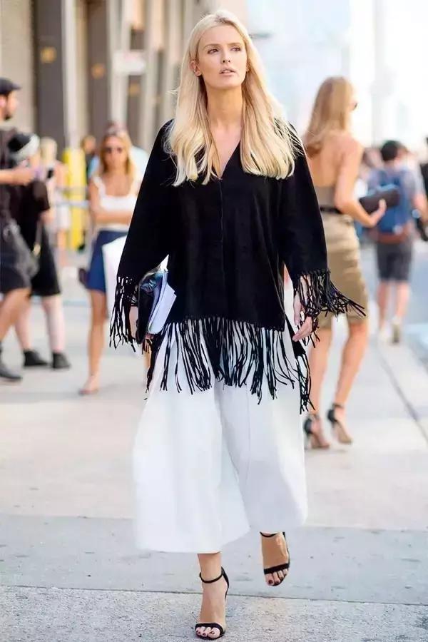 不過我們經常會看到很多個性時髦的流蘇街拍,感覺難以駕馭,就像這樣的大面積流蘇掛在身上,有種累贅感——