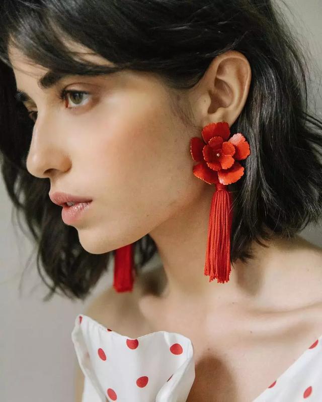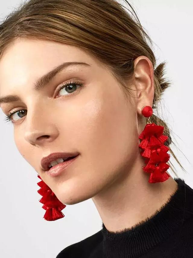 流蘇耳環也能為你的造型加分,最重要的是顏色的搭配上,基礎款的襯衫搭牛仔褲,加上紅色的流蘇耳環就是點睛之筆,黑色和金色的搭配則是慢慢的高級感。