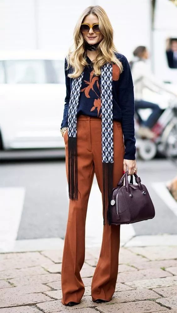 白襯衫搭配焦糖色闊腿褲,加上同色系的流蘇包包,氣質滿分!